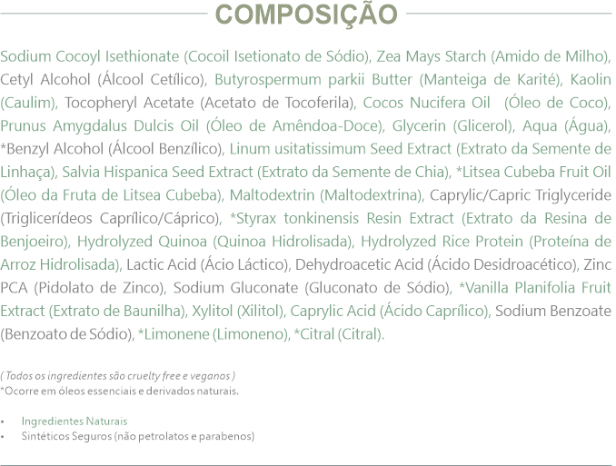 _______________ Um convite para redescobrir a beleza natural dos seus cachos, ondas e crespos. Você já sentiu que seus fios pedem por um cuidado mais verdadeiro, profundo e consciente? O Shampoo Sólido Hidratação nasceu para responder a esse chamado. Criado para atender às necessidades reais dos cabelos cacheados, ondulados e crespos, ele combina ingredientes de origem natural, tecnologia cosmética segura e sustentabilidade, entregando muito mais do que limpeza: ele promove tratamento profundo desde a raiz até as pontas. A hidratação e a nutrição acontecem graças à poderosa combinação de Manteiga de Karité, Óleo de Coco e Óleo de Amêndoas-Doces, ingredientes ricos em ácidos graxos e vitaminas que ajudam a repor os lipídios essenciais, devolvendo maciez, brilho e maleabilidade aos fios. Essa sinergia fortalece a fibra capilar e melhora a textura do cabelo, deixando-o visivelmente mais saudável. Para potencializar a definição e o controle do frizz, a fórmula traz extratos naturais de Linhaça e Chia, conhecidos por suas mucilagens hidratantes que formam um filme protetor leve sobre os fios. O resultado são cachos, ondas e crespos mais definidos, alinhados e com movimento natural. O tratamento é reforçado pelas proteínas hidrolisadas de Quinoa e Arroz, que penetram na fibra capilar auxiliando na reconstrução, fortalecimento e aumento da elasticidade, ajudando a prevenir a quebra e o aspecto opaco. A fórmula ainda conta com Vitamina E, um poderoso antioxidante que protege os fios contra agressões externas, como poluição e estresse ambiental, prolongando a saúde e a vitalidade dos cabelos. Enquanto a espuma cremosa envolve seus fios, você sente a fragrância envolvente da Baunilha, do caloroso Benjoin e da energia fresca da Litsea Cubeba. Um aroma que acolhe, desperta e acompanha você muito além do banho. A verdadeira magia está nos ativos que trabalham em sinergia com a curvatura natural dos fios. 🌍 Cuidado consciente que faz a diferença Em formato sólido, o shampoo rende muito mais do que as versões líquidas, reduz o uso de plástico e é perfeito para quem busca praticidade e sustentabilidade sem abrir mão da eficácia. Sua fórmula utiliza ingredientes naturais e sintéticos seguros de origem vegetal, cuidadosamente selecionados para respeitar os fios e o meio ambiente. |
